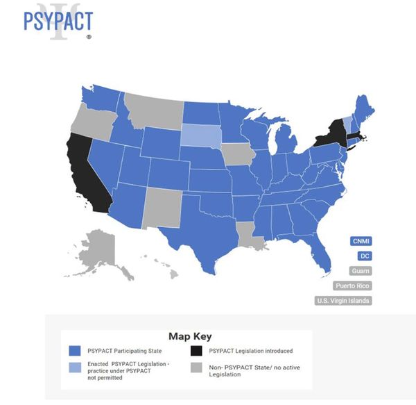 Although our practice is based in Wisconsin, Dr. Domenick Tirabassi and Dr. Jamie Camphouse are authorized to provide telepsychology services to individuals residing in PSYPACT-participating states. PSYPACT is an interstate compact that allows licensed psychologists to deliver telehealth services across state lines in a manner that is both legally compliant and ethically sound. States highlighted in dark blue on the map represent where telepsychology services are available through PSYPACT.